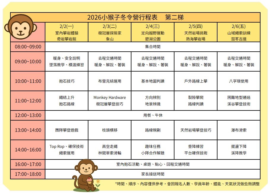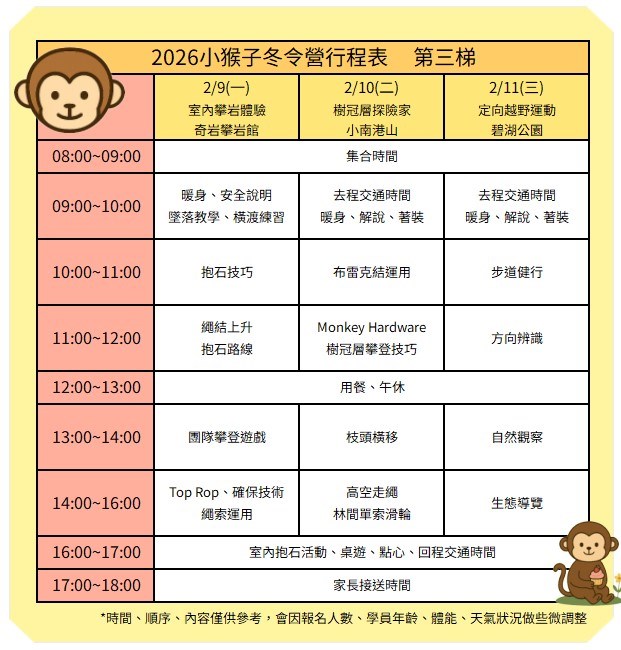 | 行程內容: 5天戶外營 (第一梯) 第1天-室內攀岩體驗,奇岩攀岩館 第2天-樹冠層探險家,小南港山 第3天-親山步道巡禮,鯉魚山 第4天-天然岩場挑戰,大砲岩 第5天-山域繩索訓練,茄苳古道 5天戶外營 (第二梯) 第1天-室內攀岩體驗,奇岩攀岩館 第2天-樹冠層探險家,象山 第3天-定向越野運動,碧湖公園 第4天-天然岩場挑戰,熱海攀岩場 第5天-山域繩索訓練,茄苳古道 3天戶外營 (第三梯) 第1天-室內攀岩體驗,奇岩攀岩館 第2天-樹冠層探險家,小南港山 第3天-定向越野運動,碧湖公園 *第三梯為輕鬆行程,適合幼兒、低年級生、體能較差者 查看每日詳細行程 👉第一梯 👉第二梯 👉第三梯 |